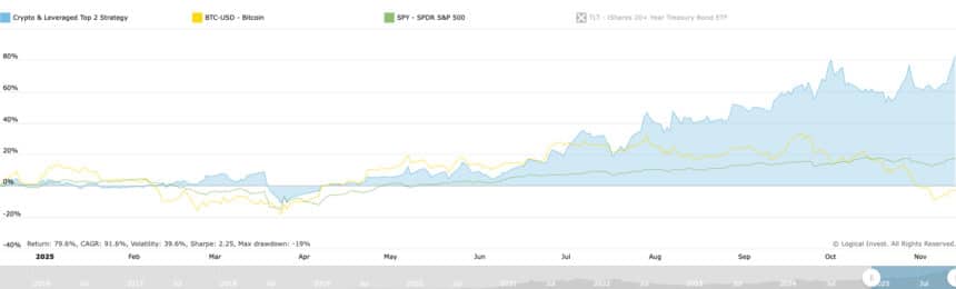 November showed why systematic strategies matter. While Bitcoin fell 17%, our Crypto & Leveraged Top 2 rotated into strength and now sits at 82.9% YTD.