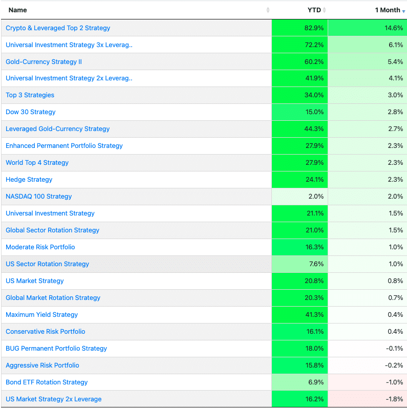 Top Performers: The Crypto & Leveraged Top 2 Strategy turned out 14.8% in November alone and leads with 82.9% YTD returns. The Universal Investment Strategy 3x Leverage follows at 6.1% MTD and 72.2% YTD.